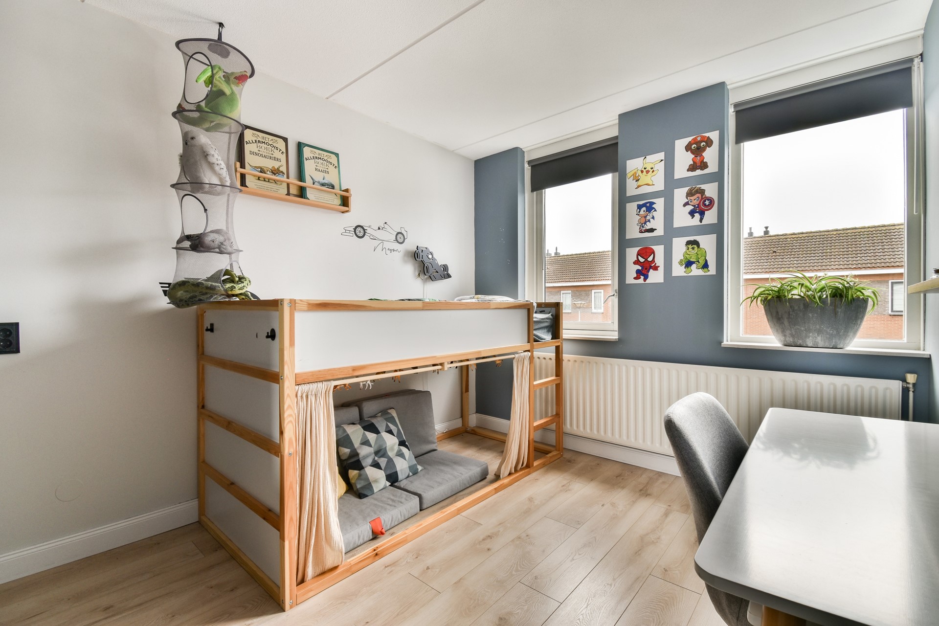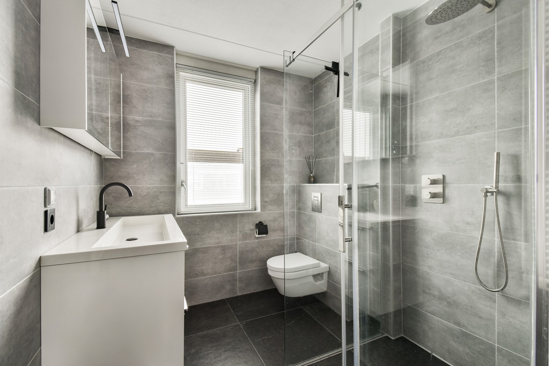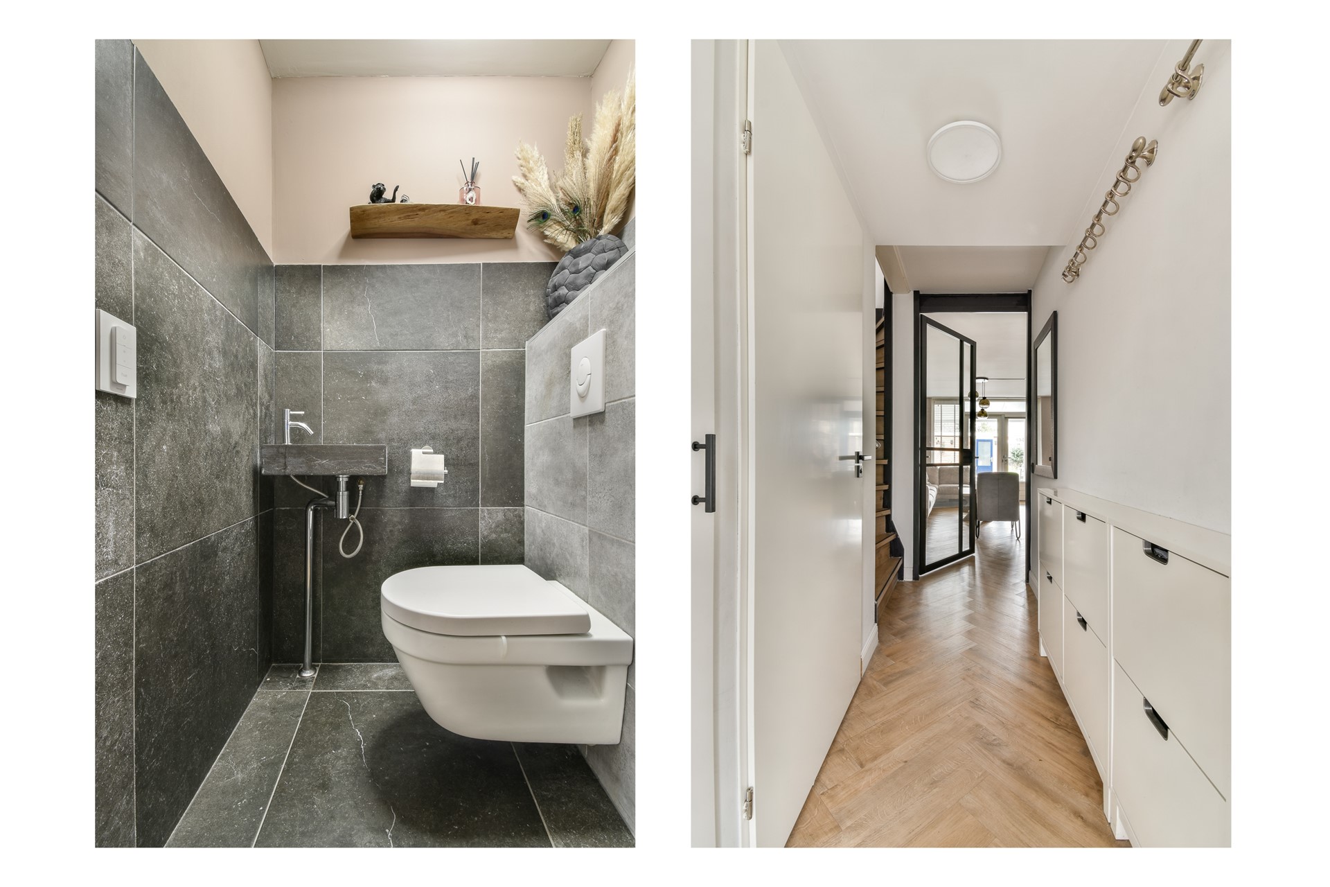 Op de eerste verdieping zijn drie slaapkamers te vinden. Eén daarvan is nu bestemd als kastenkamer en grenst aan de hoofdslaapkamer. De derde kamer ligt, net als de badkamer, aan de voorzijde van het huis. De badkamer is, net als de keuken, in 2020 geplaatst. Naast een eigentijdse inrichting is er een tweede toilet, een inloopdouche met regen- en handdouche en een breed wastafelmeubel.